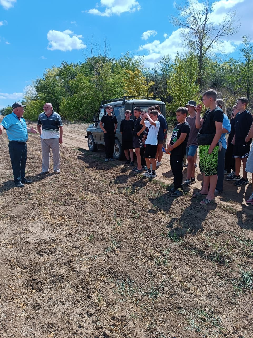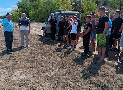 Первую часть занятия ребята провели на полях крестьянско-фермерского хозяйства «Кузнецовский». Здесь агроном КФХ «Кузнецовский» Ефимов В.П. наглядно продемонстрировал, какую роль играет орошение в выращивании полевых культур в засушливом Волгоградском климате. Школьники узнали о современных технологиях полива и воочию увидели результат труда мелиораторов – богатый урожай на плодородной земле.